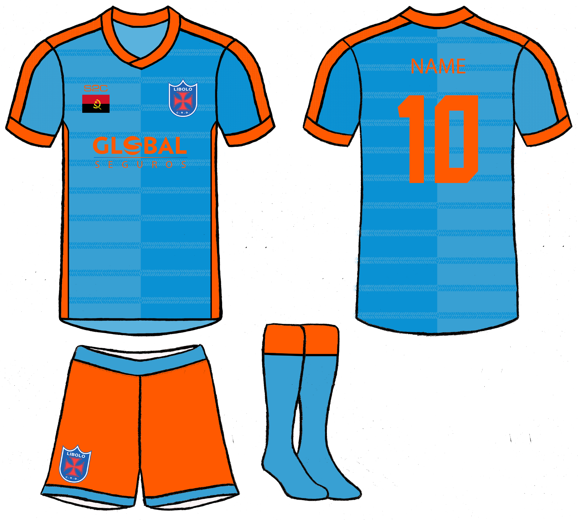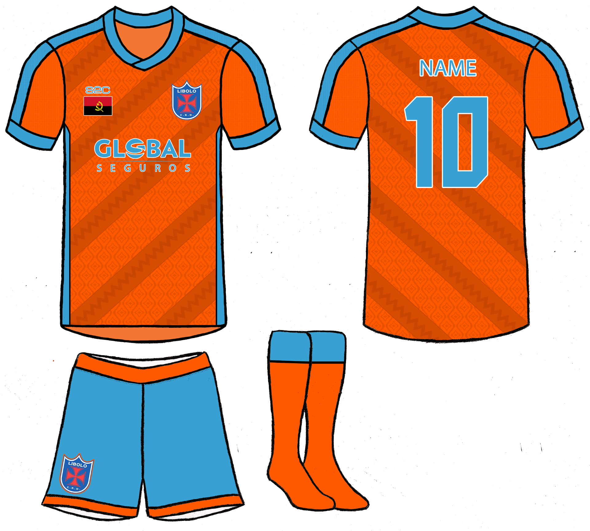 Uniforme em laranja com desenhos tribais em marca d'água, com detalhes na camisa, meiões e short em azul claro.